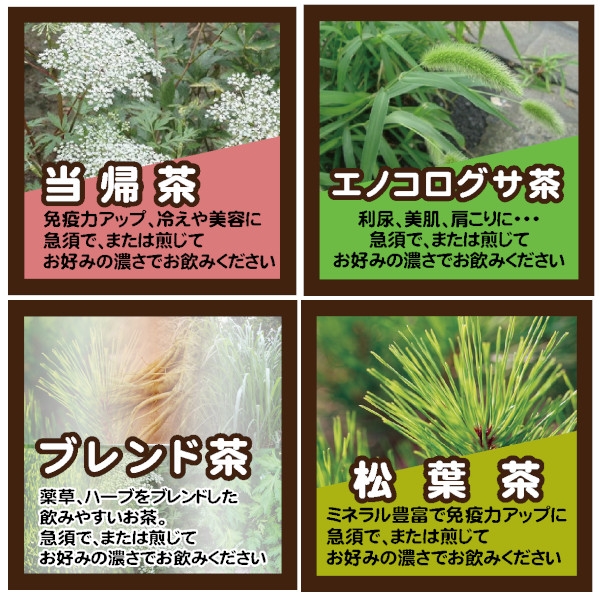 各種お茶(当帰茶、ビワの葉茶、松葉茶、ブレンド茶など)がとても人気です!