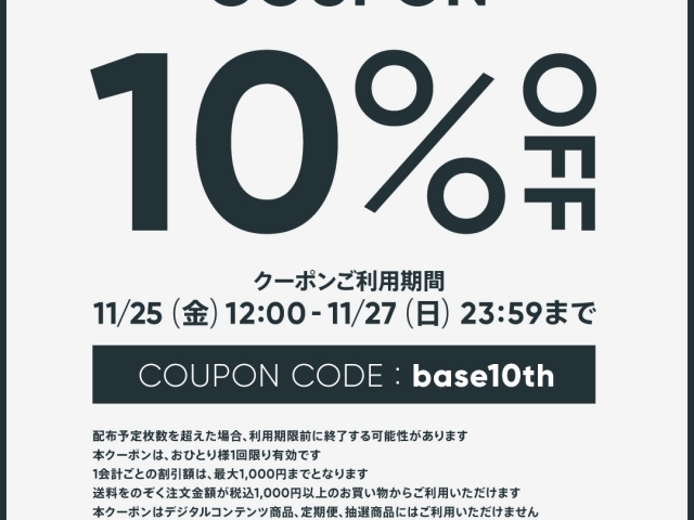 商品購入画面でクーポンコード「base10th」を入力してください。
