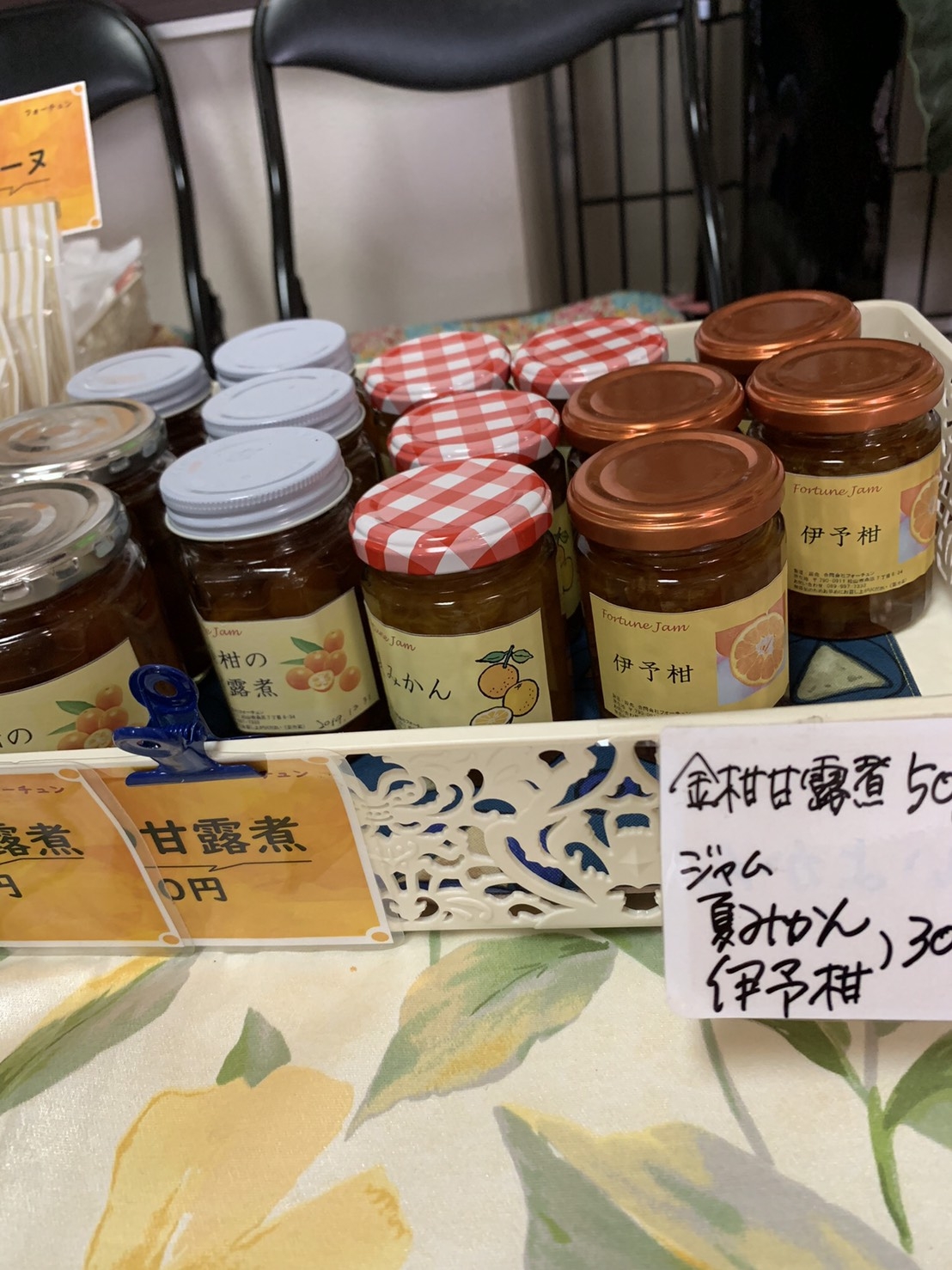 砥部病院の入り口ではミニ三津浜焼き・大判焼きの実演販売、エントランスでは加工品を取り揃えております。