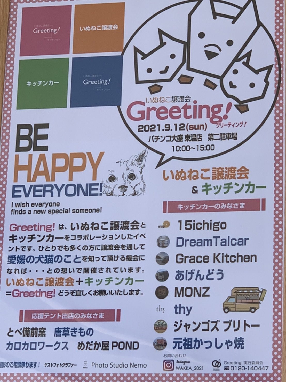 9/12(土)にパチンコ大盛 東温店駐車場で犬猫譲渡会&キッチンカーのイベント