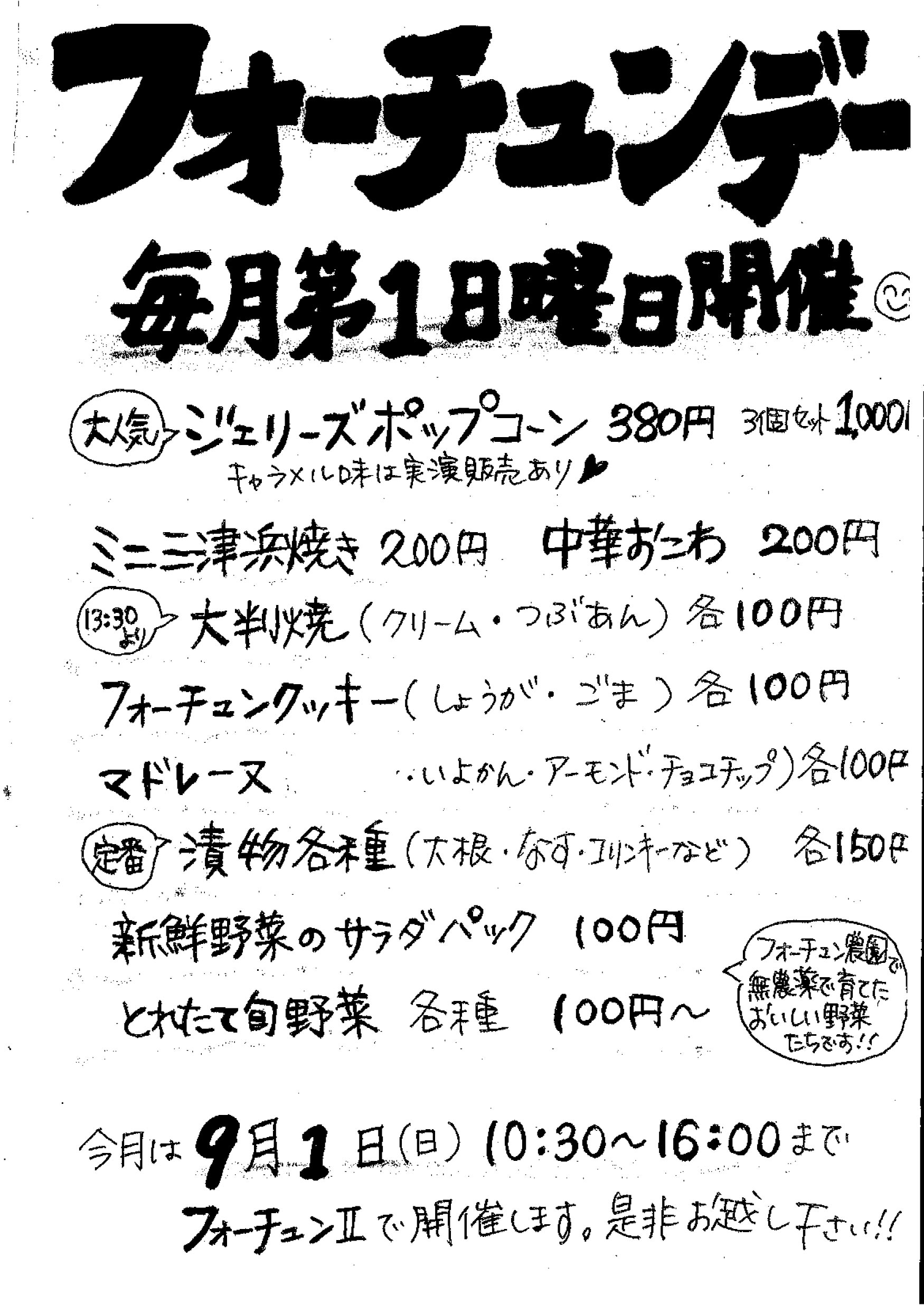 今月は9/1(日)の10:30~16:00、フォーチュンⅡにて開催します。