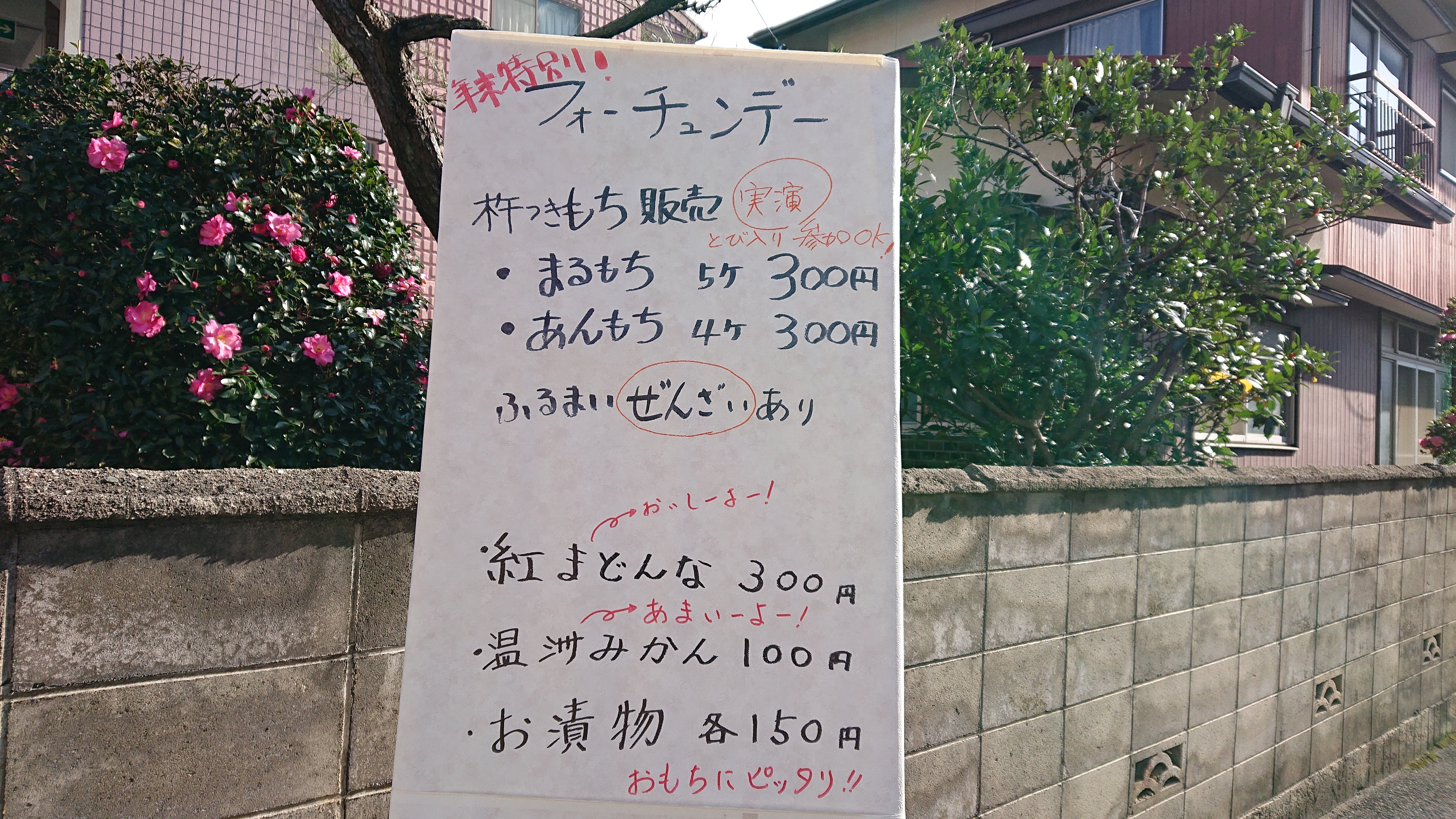 12/14(土)フォーチュンⅡの販売ブースを開放して餅つき&販売会を行いました。 ご来場の皆さんにぜんざいをふるまい、温まっていただきました。 またお漬物、紅マドンナも同時に販売しご好評いただきました。ありがとうございました。 ついたおもちは販売分とスタッフ配布分と、たくさんつき大変盛り上がりました。 なお、1月のフォーチュンデーは1月12日となっております。 みなさまのお越しをおまちしております。